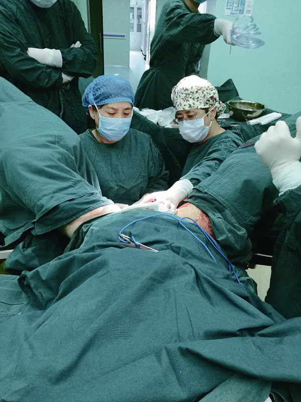 随着第一次手术的顺利完成,患者身体情况转好,生命体征趋向平稳。在确认了患者之前的骨科、泌尿外科、妇科等多科治疗恢复良好的条件下,烧伤科针对患者的大面积烧伤情况分别在5月27日、6月1日、6月9日进行了后续的手术治疗。林贞姬主任和烧伤科医务人员在几次手术中为患者分别行下肢的清创扩创VSD负压引流术、上肢清创削痂VSD负压吸引术、上肢清创植皮。术中为患者清除左上肢烫伤创面结痂面积6%、切除左下肢、左侧臀部、腰背部创面坏死痂皮19%。林贞姬主任又从患者背部、右上肢、右下肢取皮制成0.5cm×0.5cm大小邮票状皮片,植于患者右侧腰臀部、右大腿创面处。手术中共去皮12%,为患者植皮面积达19%。后续的治疗还在逐步进行,患者在烧伤科医生的共同努力下好转起来……
