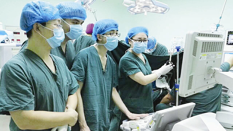 王丽岩主任医师(右一)正在对患者施行经食管超声心动图术中实时监测