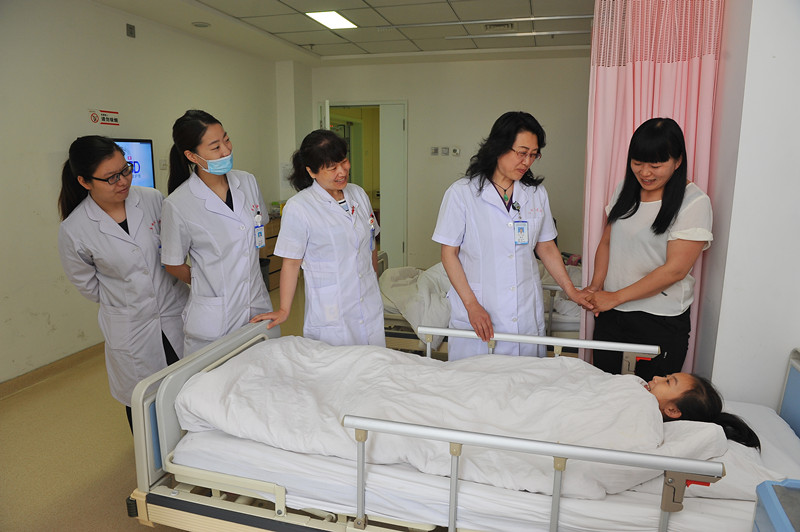 妇科2组主任谢华(右二)正在检查术后恢复中的患儿